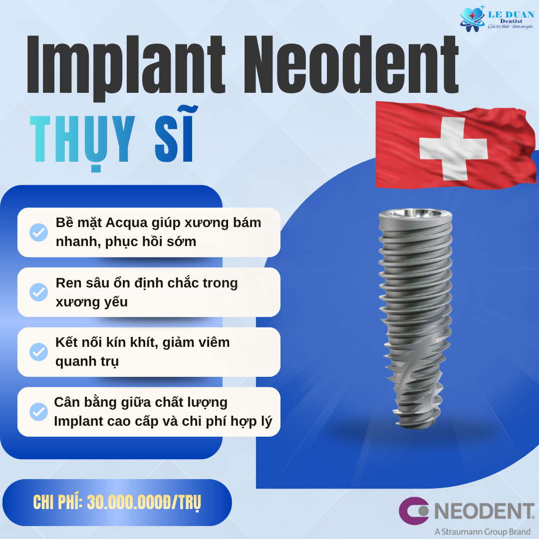 Cấy ghép Implant là giải pháp phục hình răng hiện đại, giúp khôi phục ăn nhai và thẩm mỹ tự nhiên. Tại Nha khoa Lê Duẩn, khách hàng tin chọn 3 dòng trụ nổi bật: ST (Hàn Quốc) – ổn định, giá hợp lý; ETK (Pháp) – tích hợp xương nhanh, thẩm mỹ cao; và Neodent (Thụy Sĩ) – bền chắc, tối ưu cho mọi tình trạng xương.