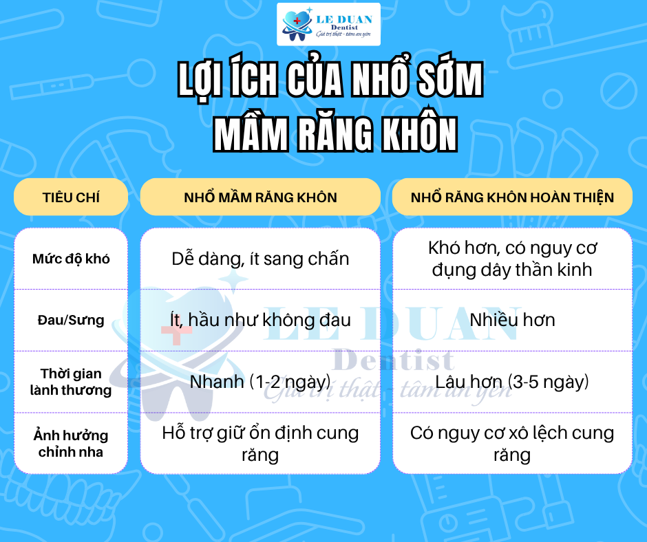 Nhổ sớm ít sang chấn hơn vì chân răng chưa hoàn chỉnh, xương hàm còn mềm: Ở giai đoạn 12–16 tuổi, mầm răng khôn chưa hoàn thiện chân răng và vùng xương quanh răng vẫn còn mềm, ít canxi hóa. Vì vậy, việc nhổ mầm răng khôn trong thời điểm này diễn ra nhẹ nhàng, ít sang chấn, ít chảy máu và thời gian hồi phục nhanh. So với việc nhổ răng khôn khi đã mọc hoàn chỉnh ở tuổi trưởng thành, nhổ sớm còn giảm thiểu nguy cơ chạm vào dây thần kinh.